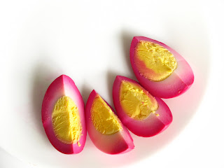 Remember the beets from last week? I made beet pickles, and dropped some boiled (shelled) eggs in the extra pickle juice. It makes 'em taste like devilled eggs, but the pink part is what has the pickle-y flavor.